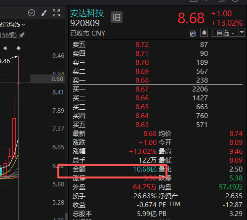 11月10日,受磷酸鐵鋰高景氣度影響,該板塊的北交所公司安達科技(920809)大漲13.02%,報收8.68元/股,總市值52億元,并以10.68億元的日成交額,位居北交所公司之首。