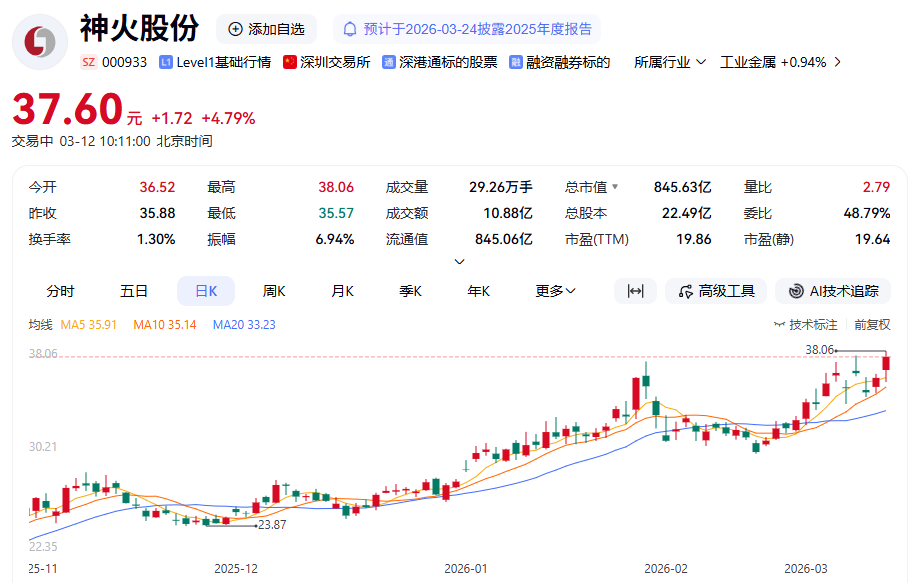 工業(yè)金屬(881168)今日反彈,中國鋁業(yè)(601600)、天山鋁業(yè)(002532)漲超6%,云鋁股份(000807)、神火股份(000933)、宏橋控股(002379)漲超5%。值得一提的是,神火股份(000933)今日股價再創(chuàng)歷史新高(883911),截至發(fā)稿,每股報37.5元,最新市值843億元。