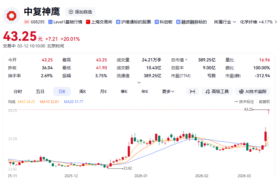 熱點(diǎn)方面,中復(fù)神鷹(688295)開盤20.01%漲停,漲幅全市場第一,并帶動化學(xué)纖維(881264)板塊全方面上漲,吉林碳谷漲超15%,泰和新材(002254)、皖維高新(600063)漲停。消息面上,中復(fù)神鷹(688295)3月11日披露新產(chǎn)品公告稱,近日公司全新推出SYT80(T1200級)碳纖維(885650)新品,實現(xiàn)SYT80碳纖維(885650)的百噸級制備。該產(chǎn)品參數(shù)為:拉伸強(qiáng)度8000MPa、拉伸模量324GPa、斷裂伸長率2.5%、體密度1.79g/cm3。