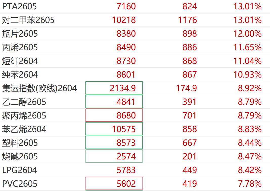 此外,對二甲苯、PTA、瓶片等品種紛紛漲停,乙二醇、苯乙烯、純苯等盤中觸及漲停。