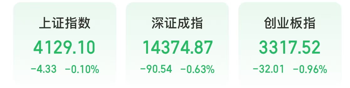 今天,A股調(diào)整。截至收盤,上證指數(shù)(1A0001)下跌0.1%,深證成指(399001)下跌0.63%,創(chuàng)業(yè)板指(399006)下跌0.96%。