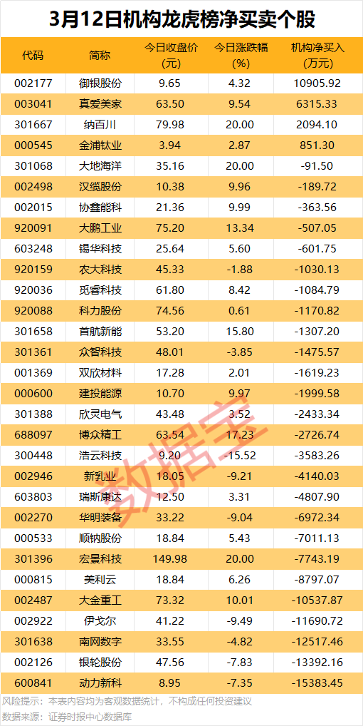 機(jī)構(gòu)凈賣出個(gè)股中,動(dòng)力新科(600841)遭機(jī)構(gòu)凈賣出1.54億元,居首;緊隨其后是銀輪股份(002126)、南網(wǎng)數(shù)字(301638)、伊戈?duì)枺?02922)和大金重工(002487),凈賣出金額均超1億元。