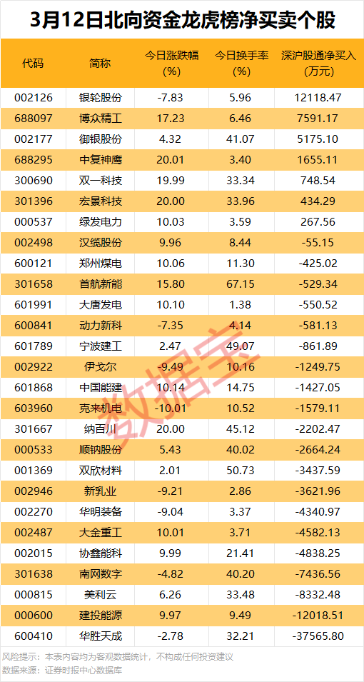 今日龍虎榜現(xiàn)身個(gè)股中,7股獲北向資金凈買入。凈買入居首的是銀輪股份(002126),金額為1.21億元;博眾精工(688097)、御銀股份(002177)、中復(fù)神鷹(688295)等緊隨其后,凈買入金額均超1000萬元。